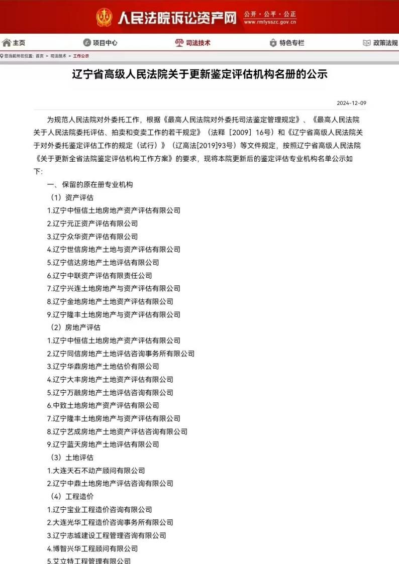 1:辽宁省高级人民法院关于更新鉴定评估机构名册的公告